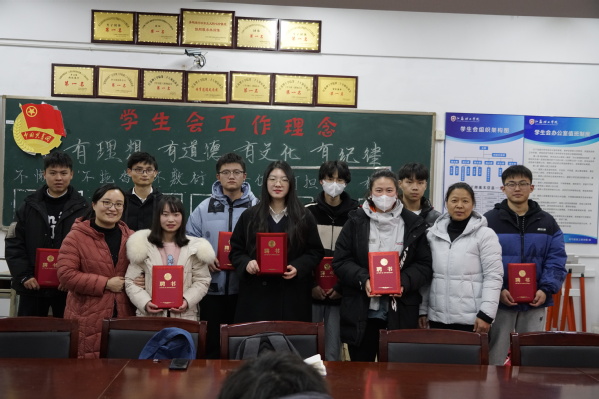 首先,钱铮老师宣读老师本届学生会部长名单,对新当选的部长表示祝贺,希望他们主动担当,敢于作为,以实际行动做好青年学生服务工作。接着,学院党委副书记钟蕾为上届学生会部长颁发聘书。随后,她对全体学生干部一年来的辛苦付出表示衷心感谢,对取得的成绩进步表示充分肯定;希望全体学生干部要充分发挥带头示范、桥梁纽带、参谋助手作用,共同维护好学生干部形象;努力学习,掌握科学的工作方法,正确处理好师生关系,充分发挥思想上合心、工作上合力、情感上合弦、行动上合拍的“四合”作用。最后,学生会主席孙祝伟对2022年寒假社会实践工作进行部署安排。