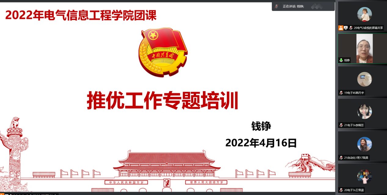 推荐优秀共青团员中的入党申请人作为入党积极分子(简称“推优”),是党赋予共青团组织的一项光荣任务。为进一步规范开展2022年上半年推优工作,麻豆影院 团委于2022年4月16日晚通过腾讯会议的形式召开推优工作专题会议暨主题团课,学院分团委书记钱铮、副书记(学生兼职)韩丹宇及全院全体团支书参加了本次会议。
