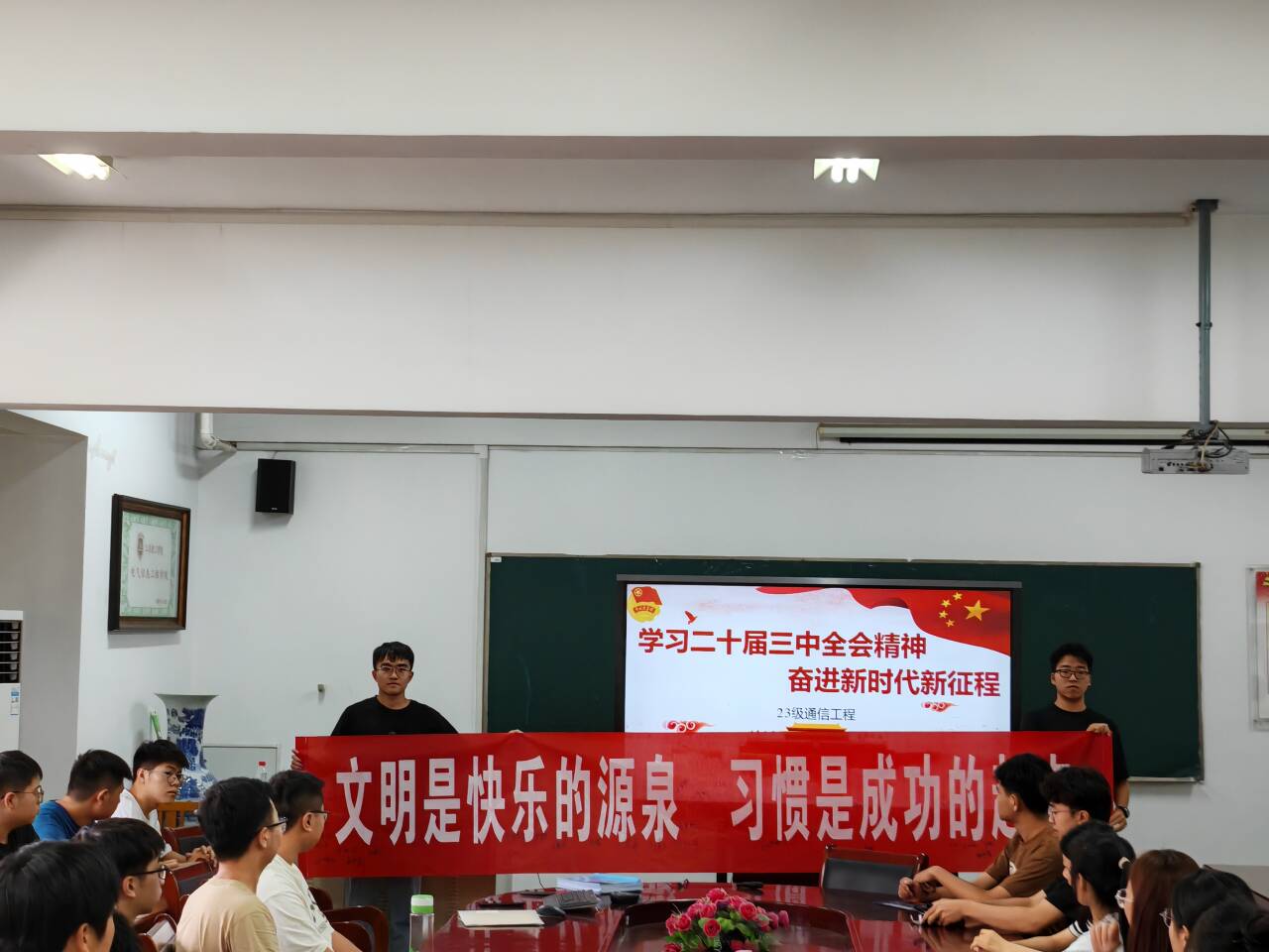 活动伊始,大家集体观看视频《二十届三中全会解读(下):这些改革举措与我们的生活息息相关》。继而,23通信2班团支书带领全体团员共同学习《中国共产党第二十届中央委员会第三次全体会议公报》、《中共中央关于进一步全面深化改革、推进中国式现代化的决定》等纲领性文件,通过集体学习、观看视频、交流讨论和分享发言的方式,深入学习领会党的二十届三中全会的重大意义、精神实质和核心要义,领会习近平总书记在全会上的重要讲话精神。