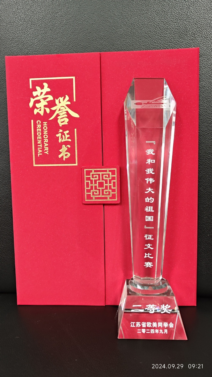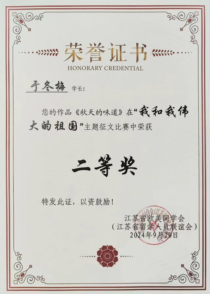 活动期间举办了“我和我伟大的祖国”征文比赛颁奖活动。我校麻豆影院 于冬梅老师的征文作品《秋天的味道》荣获二等奖。于冬梅老师结合自身儿时的故乡回忆、读博和研学经历,以生动的故事和真情实感,歌颂了家乡的秋香和祖国的芬芳,也展现了留学人员在教育一线奋斗耕耘的时代风采和精神风貌。