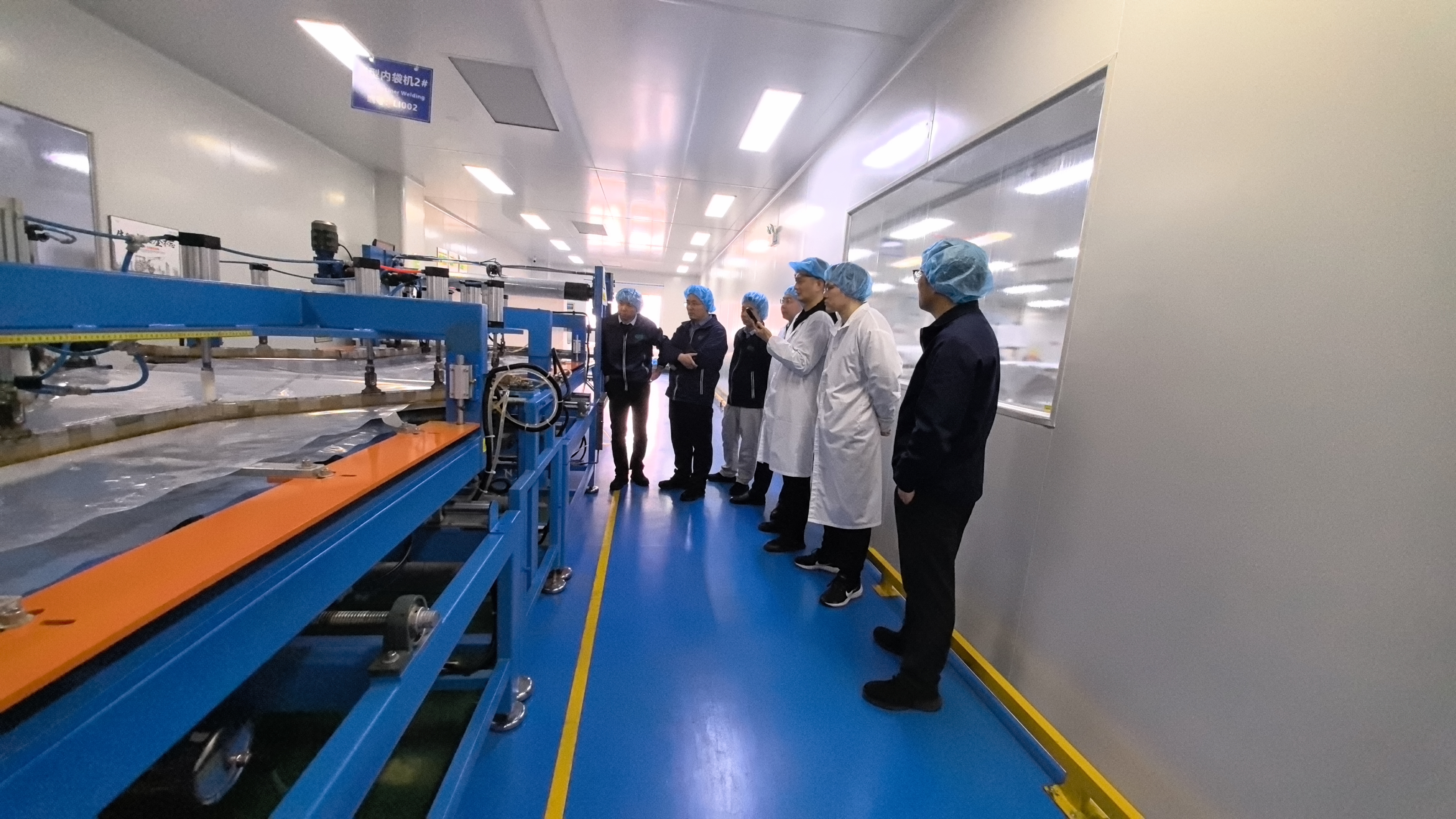 随后,一行人参观了企业洁净生产车间,对自动化内袋机等核心生产设备的运行原理、工艺流程与技术参数等方面进行了实地考察与广泛交流。