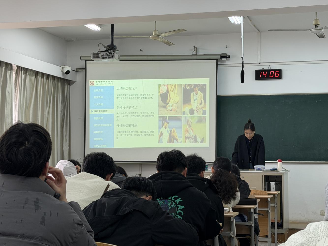 活动现场,武文婷护师结合临床护理经验与青年学生运动习惯,系统讲解运动损伤分类、高发部位、高危因素等核心知识,重点围绕踝关节扭伤、膝关节损伤、肌肉拉伤、骨折脱位等校园常见损伤,用通俗语言拆解识别要点与应急处置方法,让师生快速掌握判断伤情、规避风险的实用技巧。